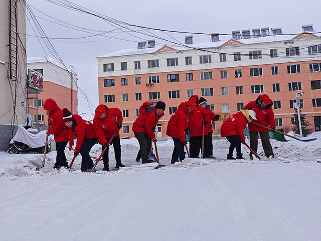 雪城义警在怡和居小区清雪。