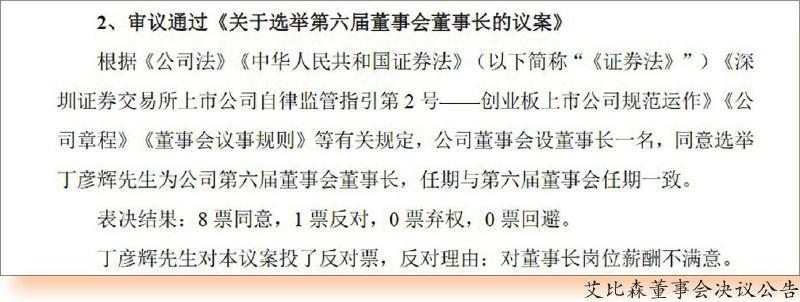 然而就在选举第六届董事会董事长的议案时,董事长丁彦辉却投出了唯一一张反对票。反对理由则十分具有戏剧性,理由是“对董事长岗位薪酬不满意”。