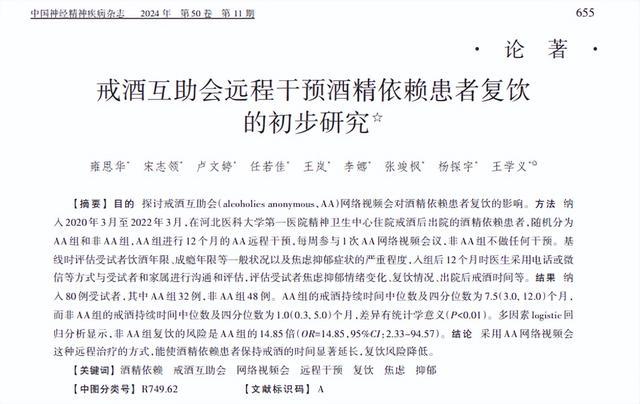 [1]雍恩华.戒酒互助会远程干预酒精依赖患者复饮的初步研究,中国神经精神疾病杂志,2024-11-25